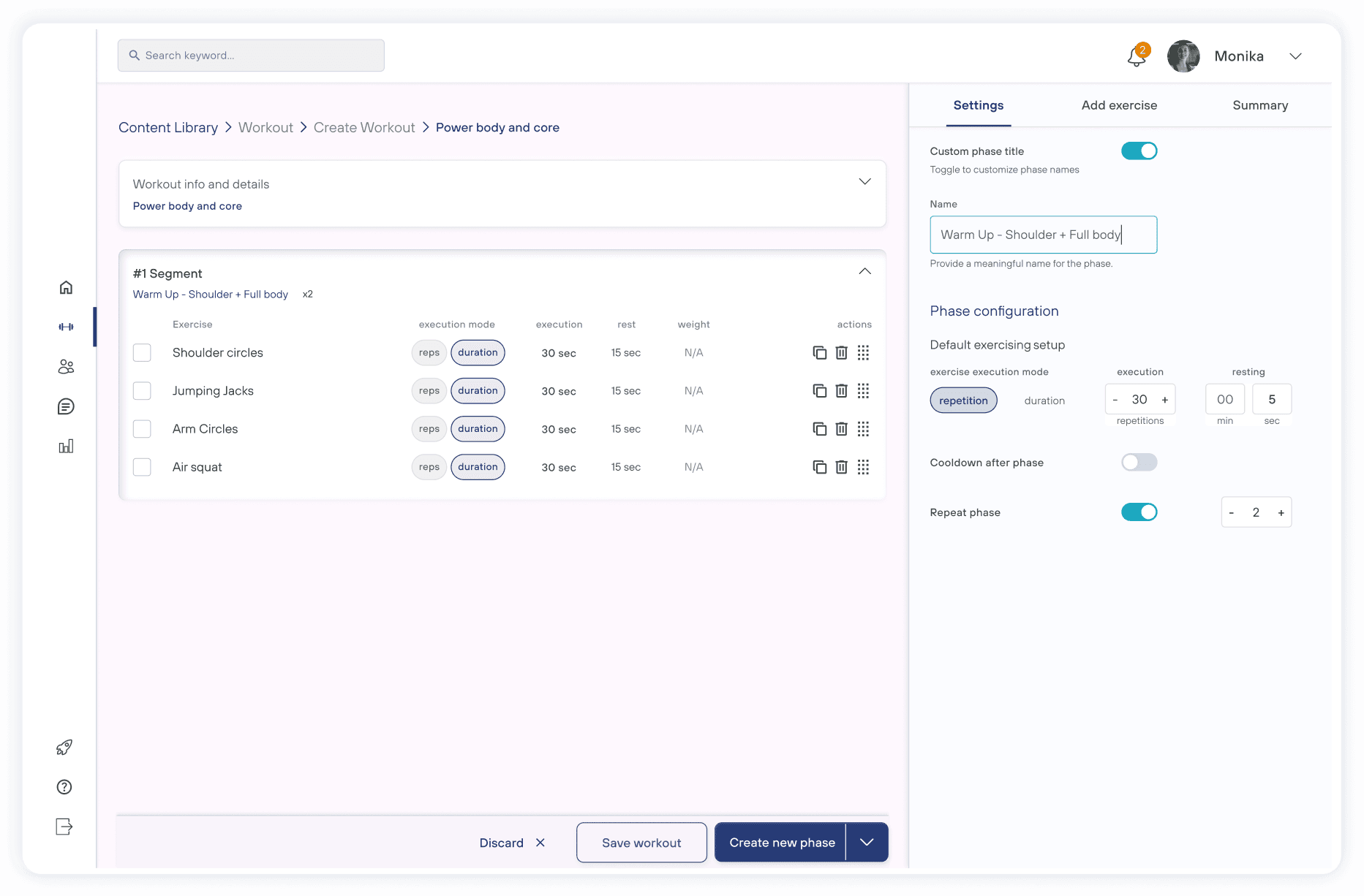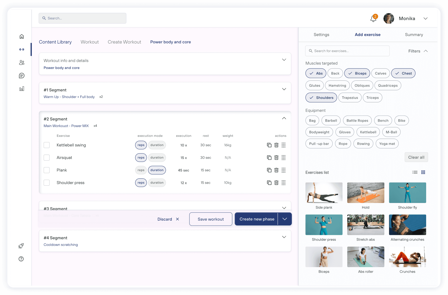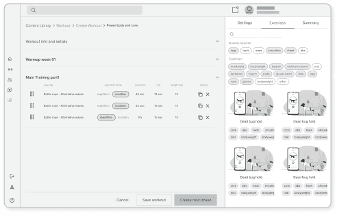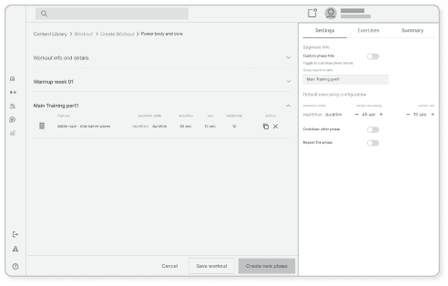 Enable the creation of segments, groups, phases, or exercises in one user flow