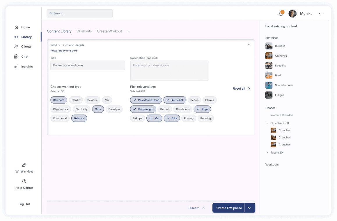 In this section of the case study, I present the design phase of Smart4Fit Online Training, focusing on the Web Admin Dashboard (trainer) and Trainee Mobile App. Through mockups, i present two critical task flows: workout creation for trainers and workout execution for trainees. These mockups are guided by key design principles, which serve as the foundation for crafting an exceptional user experience.