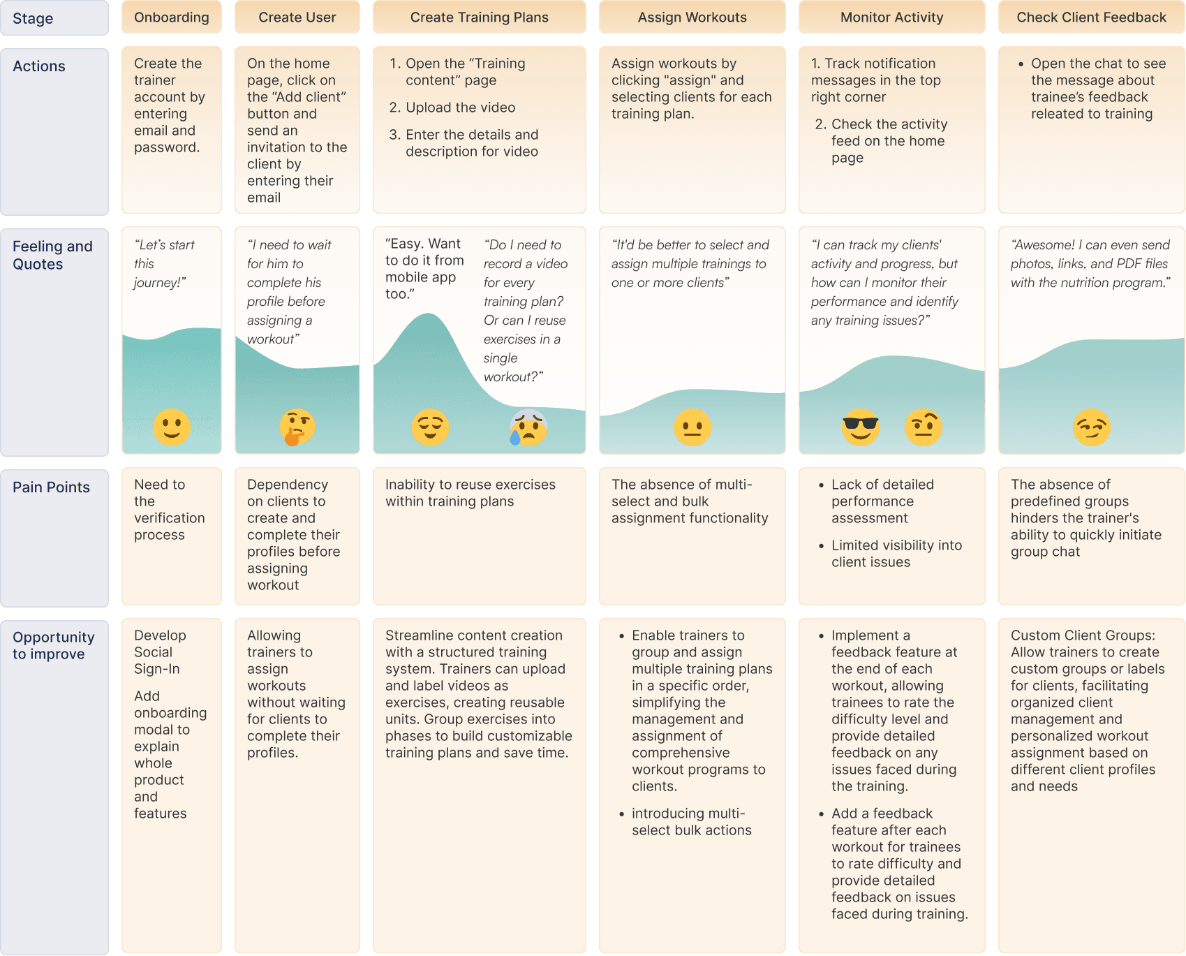 During the beta testing phase, I utilized a Usability Journey Map to gain insights into user behavior(both trainer and trainee), pain points, and needs.